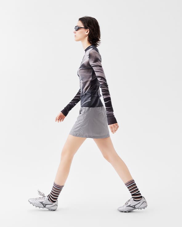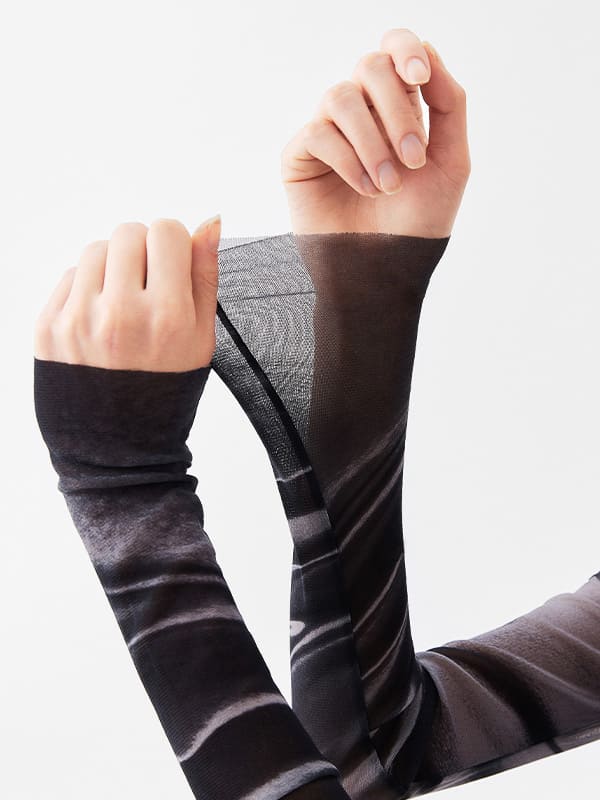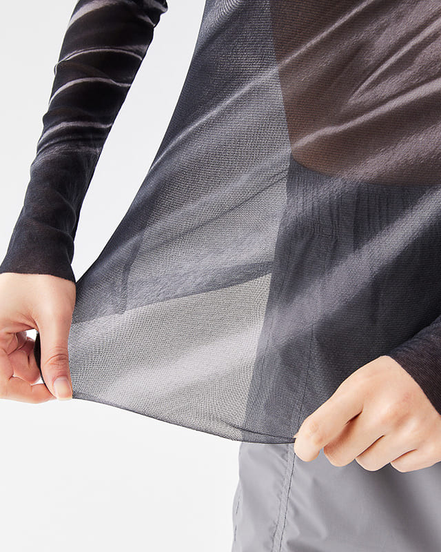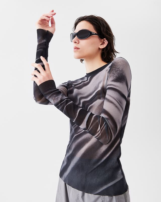 This long sleeve mesh top comes in soft greys and blacks, like smoke drifting across the body. The fabric is sheer and lightweight with a close, easy stretch fit that sits like a second skin. From a distance it reads almost monochrome; up close you see the fluid print wrapping around the torso and sleeves, giving a quiet but sharp edge to simple outfits.